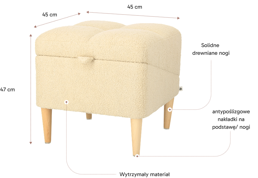 - W przypadku plam - usuń je natychmiast za pomocą łagodnego detergentu lub specjalnych środków do tkanin tapicerskich.